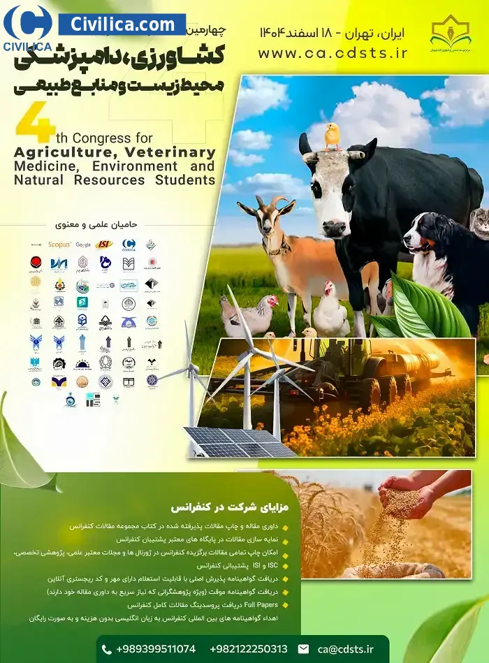 چهارمین کنگره بین المللی دانشجویان کشاورزی، دامپزشکی، محیط زیست و منابع طبیعی در تاریخ ۱۸ اسفند ۱۴۰۴ توسط ، مرکز توسعه علمی و فناوری دانشجویان در شهر تهران برگزار خواهد شد.با توجه به اینکه این همایش به صورت رسمی برگزار می گردد، کلیه مقالات این کنفرانس در پایگاه سیویلیکا و نیز کنسرسیوم محتوای ملی نمایه خواهد شد و شما می توانید با اطمینان کامل، مقالات خود را در این همایش ارائه نموده و از امتیازات علمی ارائه مقاله کنفرانس با دریافت گواهی کنفرانس استفاده نمایید.