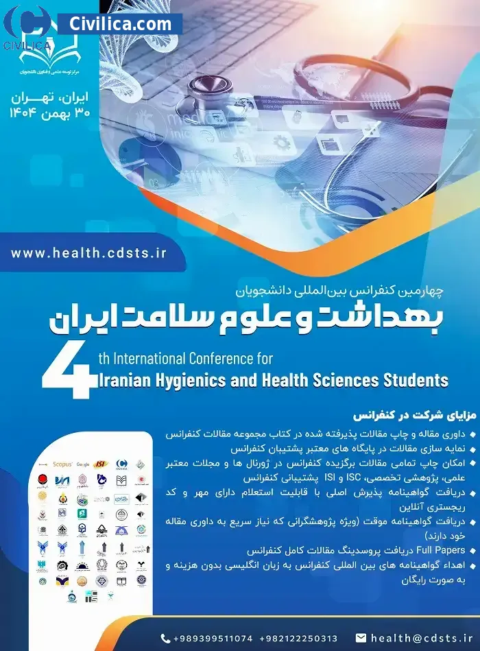 چهارمین کنفرانس بین المللی دانشجویان بهداشت و علوم سلامت ایران در تاریخ ۳۰ بهمن ۱۴۰۴ توسط ، دبیرخانه دائمی کنفرانس در شهر تهران برگزار خواهد شد.با توجه به اینکه این همایش به صورت رسمی برگزار می گردد، کلیه مقالات این کنفرانس در پایگاه سیویلیکا و نیز کنسرسیوم محتوای ملی نمایه خواهد شد و شما می توانید با اطمینان کامل، مقالات خود را در این همایش ارائه نموده و از امتیازات علمی ارائه مقاله کنفرانس با دریافت گواهی کنفرانس استفاده نمایید.
