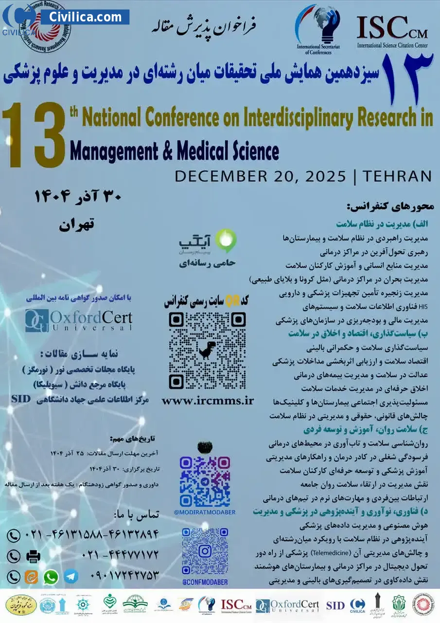 سیزدهمین همایش ملی تحقیقات میان رشته ای در مدیریت و علوم پزشکی در تاریخ ۳۰ آذر ۱۴۰۴ توسط ، در شهر تهران برگزار گردید.این همایش تحت حمایت سیویلیکا بوده است و به محض اتمام مراحل نمایه سازی، مقالات آن از طریق همین پایگاه منتشر خواهد شد.