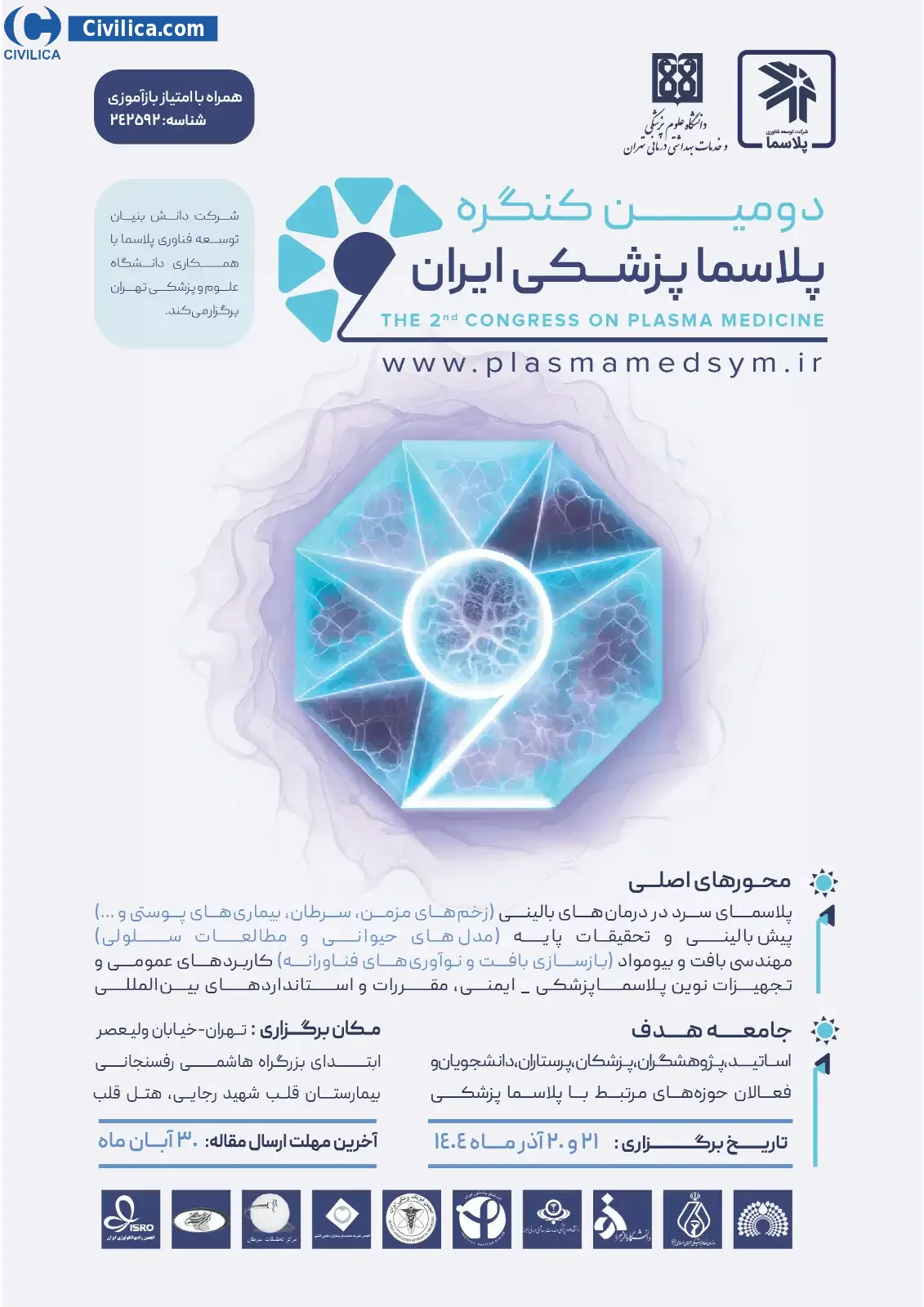 دومین کنگره پلاسماپزشکی ایران در تاریخ ۲۰ آذر ۱۴۰۴ توسط ، شرکت دانش بنیان توسعه فناوری پلاسمادانشگاه علوم پزشکی تهران در شهر تهران برگزار خواهد شد.با توجه به اینکه این همایش به صورت رسمی برگزار می گردد، کلیه مقالات این کنفرانس در پایگاه سیویلیکا و نیز کنسرسیوم محتوای ملی نمایه خواهد شد و شما می توانید با اطمینان کامل، مقالات خود را در این همایش ارائه نموده و از امتیازات علمی ارائه مقاله کنفرانس با دریافت گواهی کنفرانس استفاده نمایید.