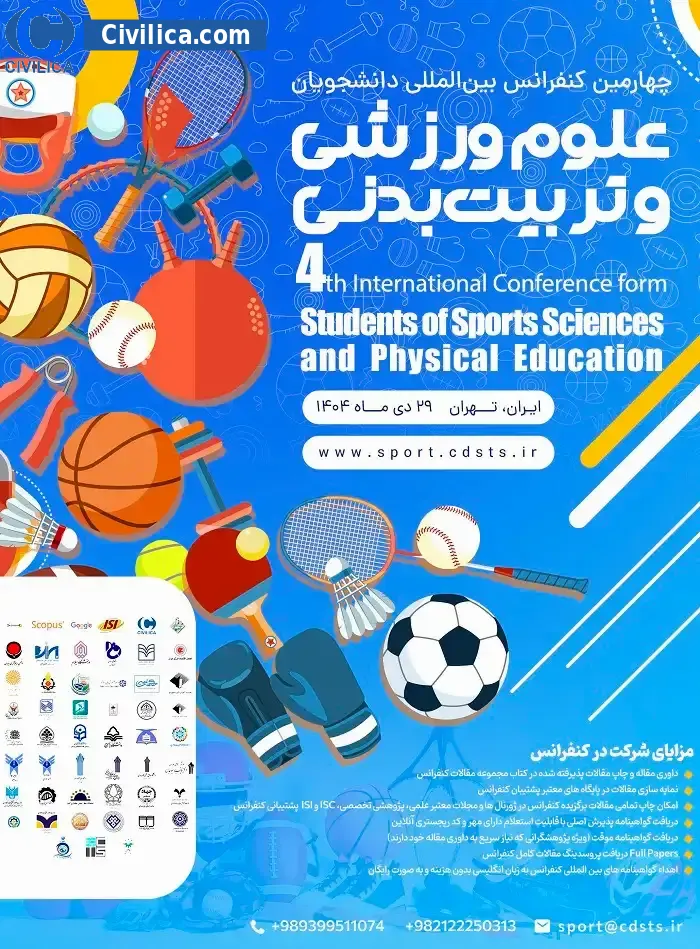 چهارمین کنفرانس بین المللی دانشجویان علوم ورزشی و تربیت بدنی در تاریخ ۲۹ دی ۱۴۰۴ توسط ، مرکز توسعه علمی و فناوری دانشجویان در شهر تهران برگزار خواهد شد.با توجه به اینکه این همایش به صورت رسمی برگزار می گردد، کلیه مقالات این کنفرانس در پایگاه سیویلیکا و نیز کنسرسیوم محتوای ملی نمایه خواهد شد و شما می توانید با اطمینان کامل، مقالات خود را در این همایش ارائه نموده و از امتیازات علمی ارائه مقاله کنفرانس با دریافت گواهی کنفرانس استفاده نمایید.